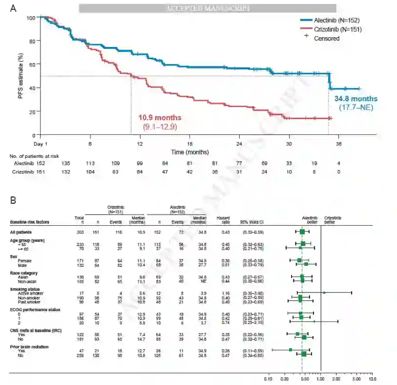 阿来替尼(alectinib)是一个高选择性的、高效ALK抑制剂,用于既往接受过克唑替尼(crizotinib)治疗进展或不能耐受的ALK阳性NSCLC患者,显示出较好的疗效。随机III期ALEX研究,在既往未接受过ALK抑制剂治疗的ALK阳性NSCLC患者中,对比了阿来替尼和克唑替尼的疗效和安全性。研究达到主要终点。在主要分析时(数据截止日期:2017年2月9日),对比克唑替尼,阿来替尼可以显著延长初治ALK阳性NSCLC的无进展生存(PFS)。在意向性人群中,PFS的HR为0.47(95%CI 0.34~0.65;P<0.001),在中位随访18.6个月后,阿来替尼组的mPFS尚未达到。