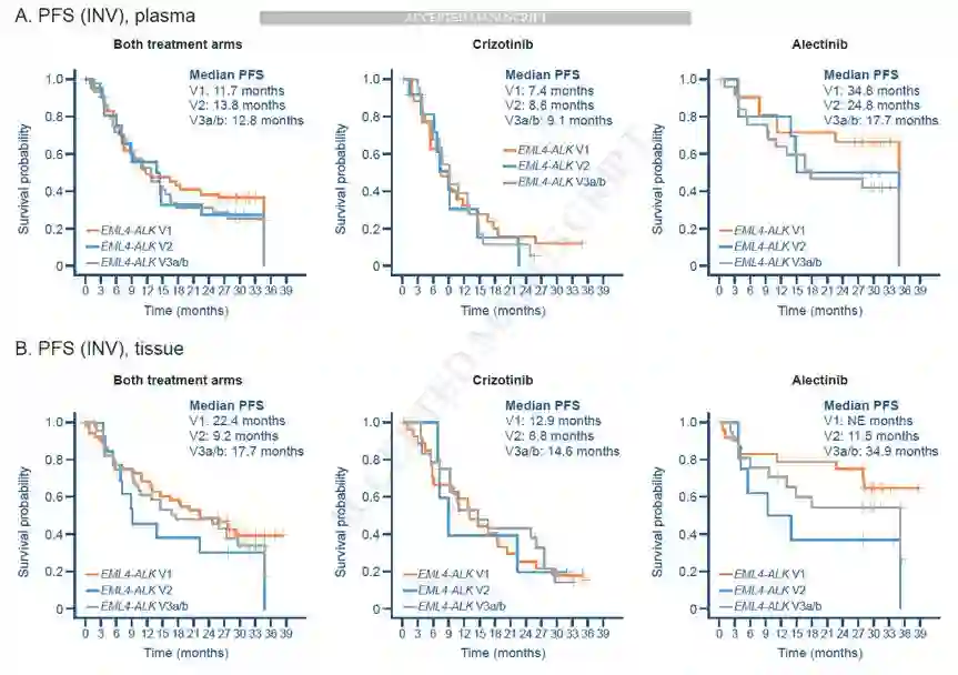 在本次更新分析中,组织和血浆BEP人群中,研究者评估的PFS HR相当,分别为HR 0.32(95%CI 0.20~0.52),P<0.0001和HR 0.42(95%CI 0.25~0.70),P=0.001;和ITT人群分析结果相当。在每一个变体亚型患者中,研究者评估的PFS对比,阿来替尼组均优于克唑替尼组,见图3A和3B。在血浆BEP人群中,变体1患者中,阿来替尼组和克唑替尼组的mPFS分别为34.8和7.4个月;变体2患者中,两组mPFS分别为24.8和8.8个月;变体3a/b患者中,两组的PFS分别为17.7和9.1个月。在组织BEP人群中,变体1患者中,阿来替尼组和克唑替尼组的mPFS分别为NR和12.9个月;变体2患者中,两组mPFS分别为11.5和8.8个月;变体3a/b患者中,两组的PFS分别为34.9和14.6个月。在任意治疗组或样本类型中,变体1,2和3a/b的PFS均未观察到显著差异(阿来替尼血浆样本,P=0.4226;阿来替尼组织样本,P=0.1114;克唑替尼血浆样本,P=0.8504;克唑替尼组织样本,P=0.9623)。