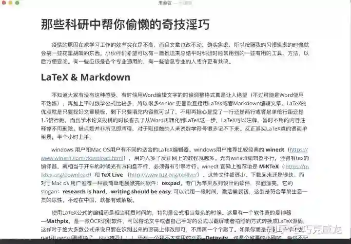 LaTeX其实和Word之间有一个折中,那就是Markdown。Markdown的话推荐一个编辑器 Typora(https://typora.io/)。Markdown就可以像LaTeX那样输入数学公式,也可以像Word那样及时编译所见即所得。这样用起来就会舒服很多。typora不想Word那样有那么多复杂的功能,界面非常简单,让人专注在需要撰写的内容上,非常地优雅,每次打开typora我的心情都不错,而我每次打开Word我都想立刻把它关了。Markdown用来写博客、公众号文章、总结笔记、知乎专栏都很好。下面就是一个页面的例子