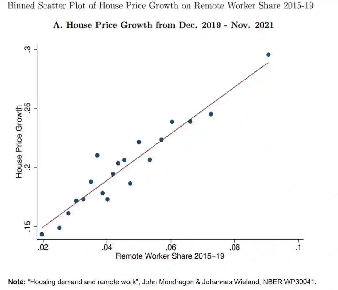 加州大学圣地亚哥分校(University of California, San Diego)经济学教授约翰内斯-维兰德(Johannes Wieland)发布的论文得出结论,远程办公驱动了房价上涨。同时,住房需求激增的地域与远程办公的热门区域高度重合。
