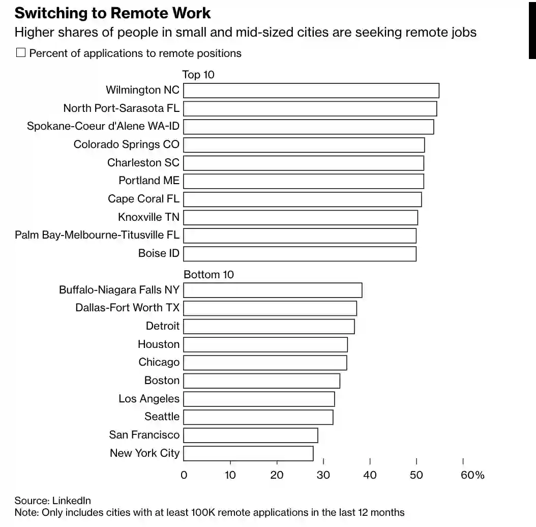 在马斯克吐槽的美国,远程办公已经改变了城市格局。数据显示,2020年1月,在LinkedIn上申请美国工作职位的人中,远程工作需求不到3%。现在,在北卡罗来纳州的威尔明顿和佛罗里达州的萨拉索塔这样的中小型城市,这一比例已经上升到50%以上。