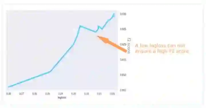 最初,和许多其他参赛者一样,我使用的是log损失作为损失函数,但如下表所示,F2分数不会随着log损失值的降低而升高。