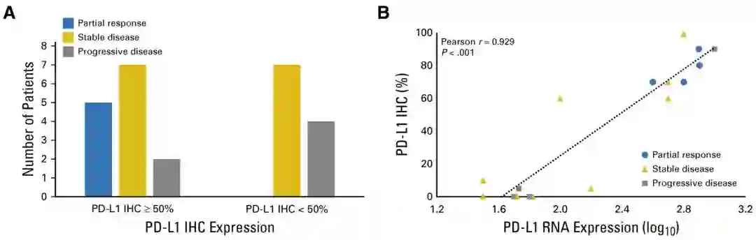 研究人员还分析了24名病人的PD-L1表达情况,发现14人(58.3%)呈现PD-L1高表达状态(>50%),而在这14人中,共有5人(35.7%)获得了局部疗效。在那些PD-L1表达不明显的病人中,没有人通过帕博利珠单抗治疗获得局部疗效。本次Ⅱ期临床试验对那些化疗后复发的胸腺上皮肿瘤患者来说可谓是雪中送炭,胸腺瘤28.6%和胸腺癌19.2%的总体生存率完全说明了K药在治疗这类病人方面的无限潜力。同时,研究人员对病人PD-L1表达的分析也显示,在胸腺上皮肿瘤中,PD-L1的表达情况可能与治疗效果有着一定的关系。虽然不良反应的发生率还比较高,但是相信进一步的研究将更有力的推动PD-1在胸腺肿瘤中的应用。