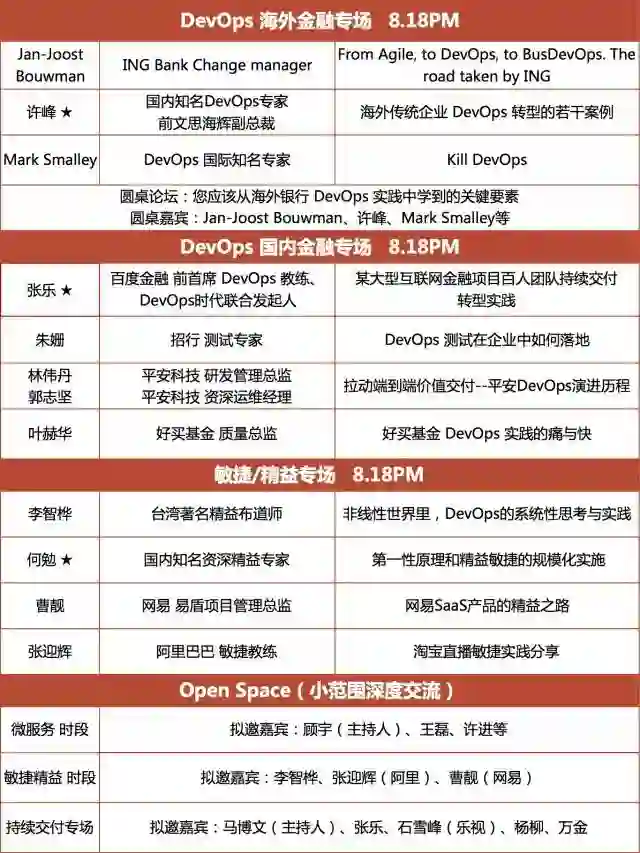 大会特色专场:【DevOps 海外金融专场】、【DevOps 国内金融专场】【敏捷/精益专场】等