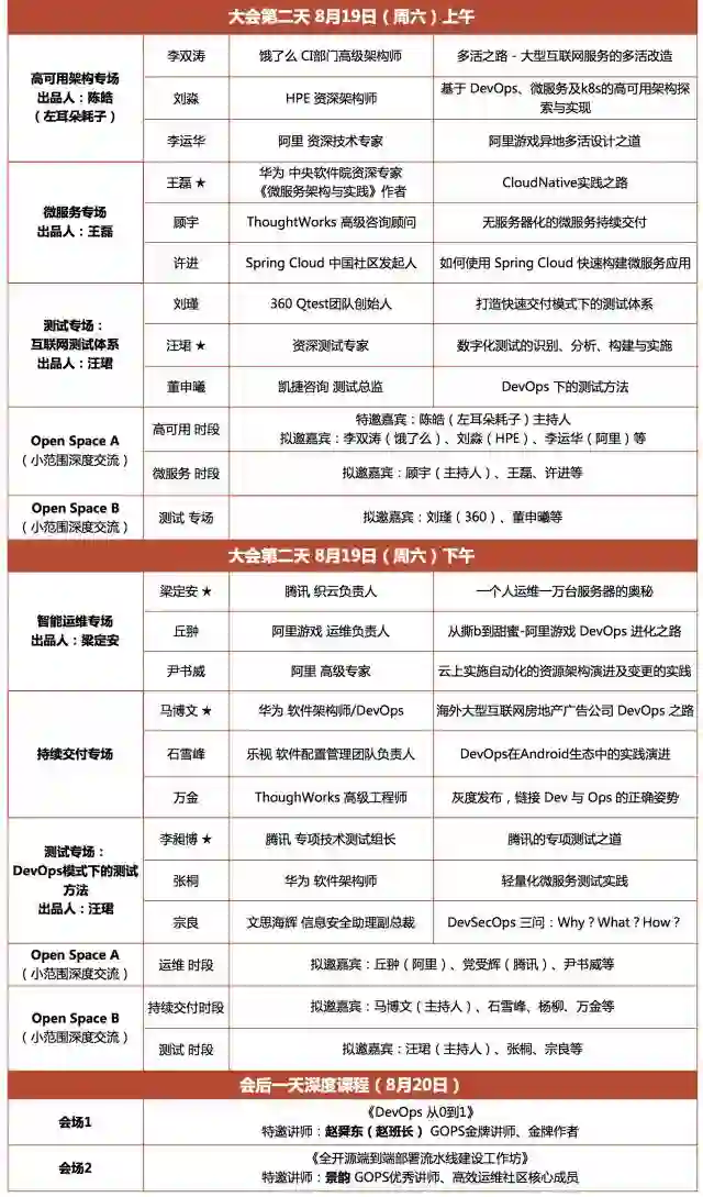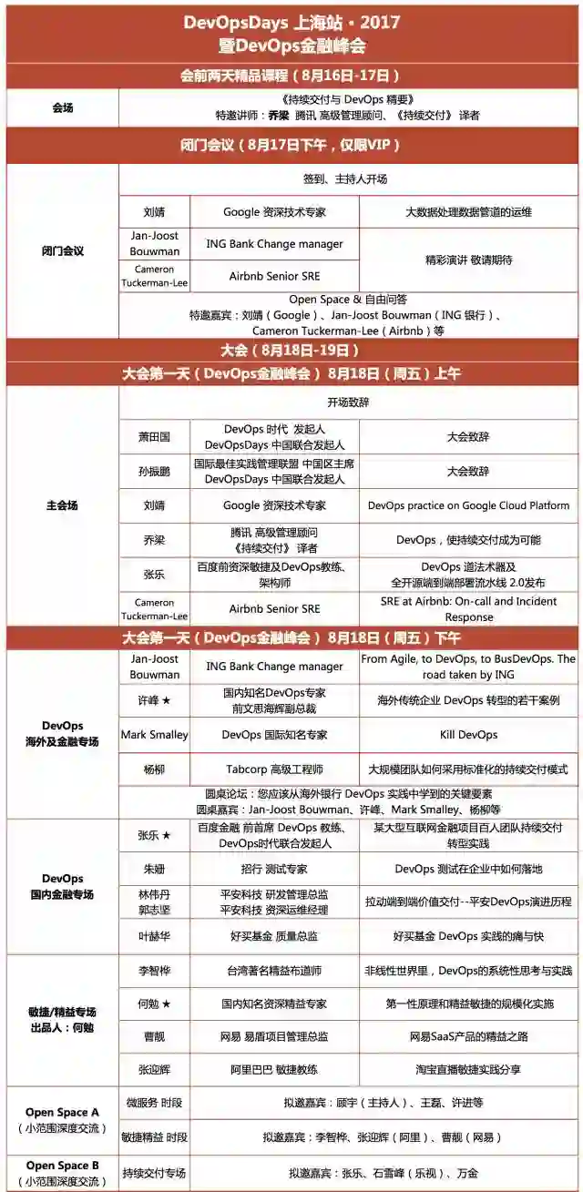 今年8月18日-19日,来自Google、Airnbnb、ING银行及各大互联网、金融公司大咖云集上海。议题覆盖:精益、敏捷、开发、运维、测试等DevOps全领域。