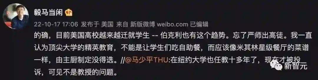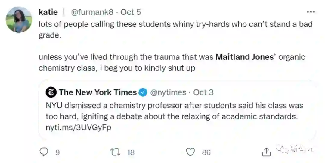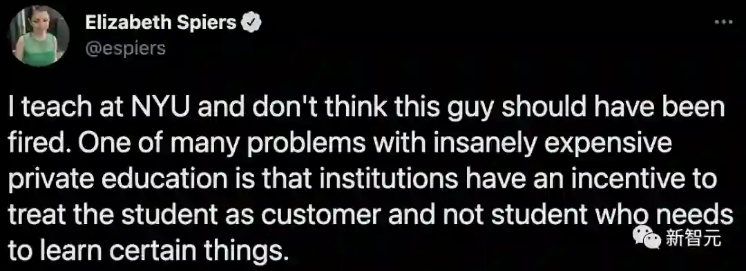 不过,教授和学生们的嘴仗还在打得热闹之时,纽约大学方面显然已经做出了自己的选择——支持学生,解雇Jones教授。校方和学院方面给出的理由是,Jones的表现「没有达到我们对教学人员的要求标准」。学院发言人在回应此事时还表示,Jones的教学「不负责任、反应迟钝、居高临下、评分也不够透明」。为了安抚学生,校方决定重新评定他们的成绩,并允许他们「追溯性退课」。纽约大学化学系主任Mark E. Tuckerman说,这是「学院给予学生的一次性例外」。该校化学系本科生研究主任Marc A. Walters说,这是学校「向学生和支付学费的人表示支持」,后者应该是指学生家长。这个处理方式在反对和支持学生投诉的人之中都引发了热烈讨论。与Jones博士密切合作的化学教授Paramjit Arora说:「校方显然是希望学生们高兴,为大学说好话,这样就会有更多人申请入学,US News的大学排名就会不断上升。」对此,纽约大学法学院教授Elizabeth Spiers也认为,现在私立教育面临的一个重要问题就是:「机构会更倾向于把学生当作顾客,而不是需要学习的学生」。担任过该课程助教、现在哈佛大学读博的Zacharia Benslimane也在给校方的电邮中为Jones辩护:「我认为这份请愿书更多的是出于对考试成绩不满意,而不是因为受到了不公平对待。而且我发现很多不断抱怨的学生,并没有使用我们提供给他们的教学资源。」在社交媒体上,也有不少支持的声音。「我总是提醒学生,如果因为一门课很难就想放弃的话,你是没有资格进入一个每天都很难的行业。」洛杉矶时报也撰文表示:大学生听好了,你的学费不是「得」来的,而是需要「挣」来的。UC伯克利的马毅教授也认为:「顶尖大学的精英教育,不能是让学生们吃自助餐,而应该像米其林星级餐厅的菜谱一样,由主厨制定没得选。」该课程的另一位助教表示,在Jones教授刚走上讲台的年代,教学标准是非常高、要求是很严格的。他的这种严格的教学风格和方法,在很多年里都没有改变。不过,现在的学生们已经变了。 这位助教还是希望学生们能认识到,让他们经历这种严格的考验,对今后的发展是有好处的。看起来,整个争议似乎说明了大学中教学方式的巨大变化。从过去教授设定标准,并期望全班达到这个标准,到现在更多支持性的、以学生为中心的教学方法。对于大学来说,是否应该减轻学生的压力,尤其是在新冠疫情依旧,对学生心理产生影响的大背景下。另一方面,对于教授来说,学生投诉的作用和权力是否被过度放大了?而面对越来越多的投诉,大学又该如何处理?