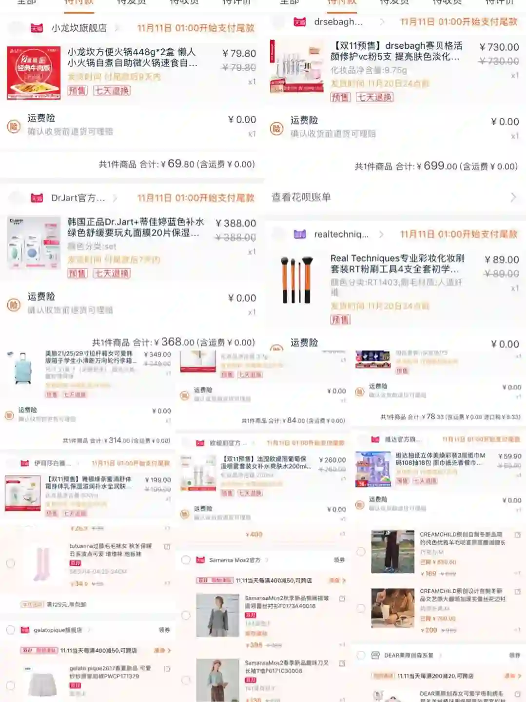 但是她在双十一抢购前给我秀了下购物车,我还是震惊了,37件待付款的商品,这还不包括已经下定金的16件。仅化妆品就有赛贝格VC粉、雅顿唇膏身体乳、雅诗兰黛面膜、悦木之源保湿水、EVE LOM面膜......