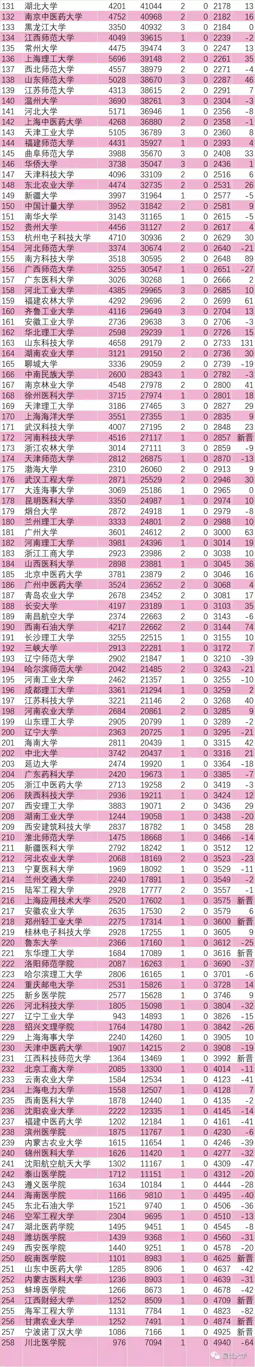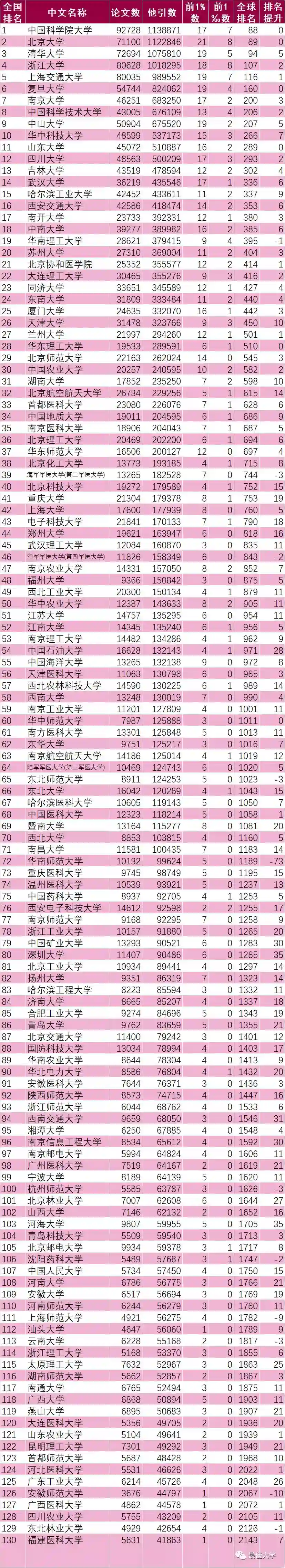 全国有学科进入全球前1%的258所高校中,中国科学院大学全球排名88位居第一。山东科技大学进步最快,进步131名,南方科技大学进步89名位居进步榜第二;西南石油大学进步74名位居进步榜第三。广州大学(63)、福建农林大学(61)、山东师范大学(46)、海南大学(42)、南京林业大学(41)、江苏科技大学(40)、山西医科大学(36)、深圳大学(35)、河海大学(35)、上海理工大学(35)、长安大学(35)等高校表现不俗,提升名称均超过35名。详见名单。