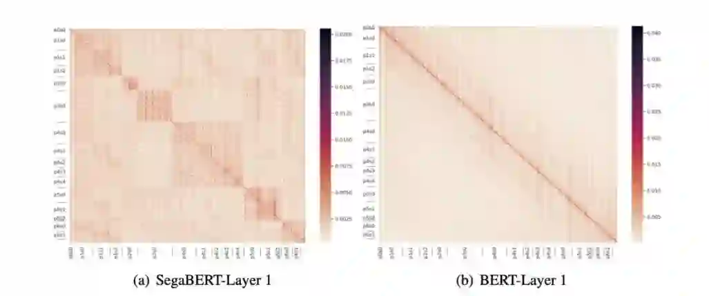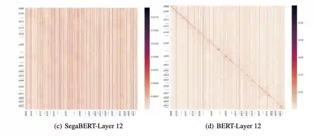 此外,我们在OpenReview的完整版本中,还看到了关于SegaBERT和BERT的注意力可视化结果。