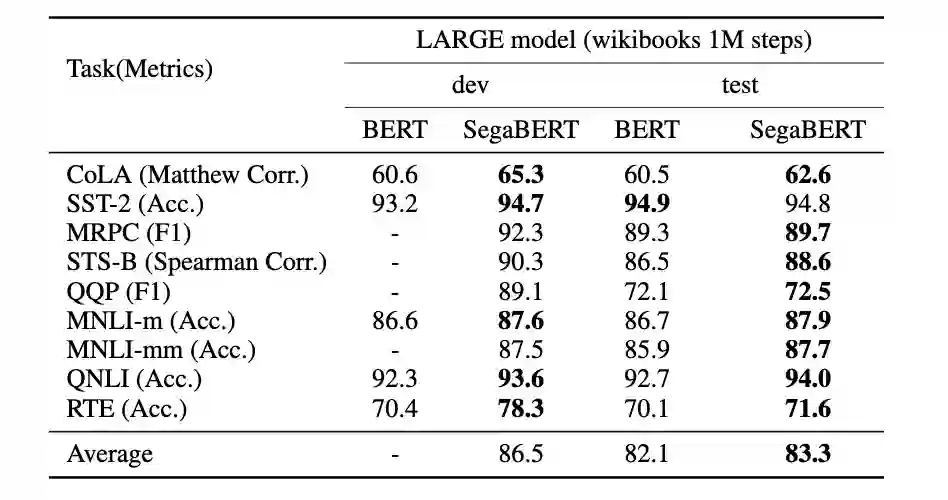 为了验证这种结构改进自身带来的功效,SegaBERT模型使用了与BERT相同的训练配置,在人类自然语言理解任务GLUE的七项任务中全面超越BERT,整体平均分数提升1.2个点。同时,SegaBERT也在斯坦福大学的阅读理解任务SQUAD中的EM score和F1 score两项指标上分别提升1.2和1.5个点。