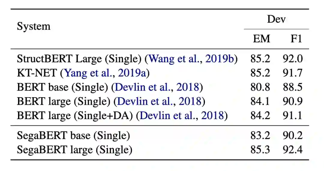 除此之外,在斯坦福大学的阅读理解任务SQUAD中,SegaBERT更是在F1 score 和 EM score上分别提升1.2和1.5个点,更是超越KT-NET(基于BERT进行融合外部知识库的微调模型)、StructBERT(多种辅助任务参与预训练的改进版BERT)和BERT_DA(利用数据增广进行微调的BERT)。