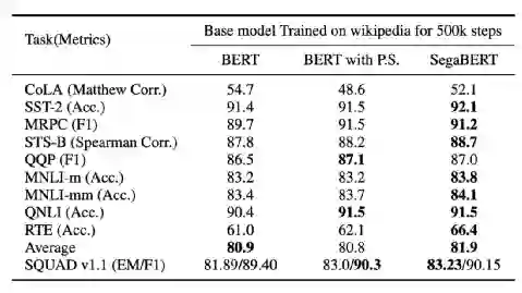 这里需要说明的是,BERT中的词位置索引是该词在整个输入的长度为512的序列中的绝对位置,而SegaBERT中词位置索引是该词在其所在句子中的相对位置。可以看到,该组实验在除CoLA外的其余7项GLUE任务和阅读理解SQUAD任务相比于原始的BERT均有明显的提升,其中SQUAD任务的结果与SegaBERT相近。