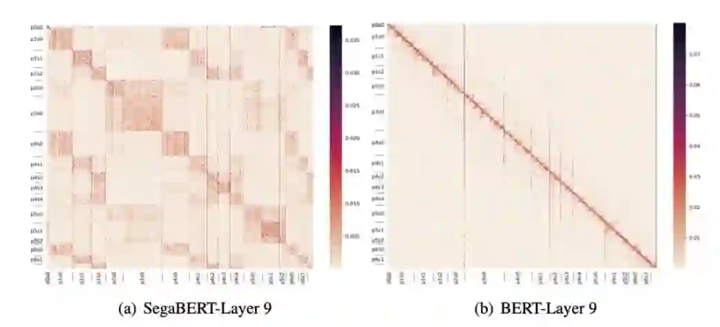 可以看到,SegaBERT不止是在各种任务集上比BERT有提升,在对输入文本的编码逻辑上也有显著区别,SegaBERT能做到片段感知,即根据段落、句子的分隔信息进行编码。而基于传统Transformer的BERT,其注意力分布主要和距离远近相关。