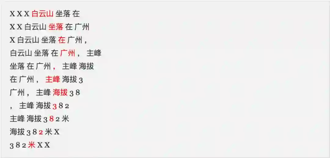 比如问题“白云山 的 海拔 是 多少 ?”,材料“白云山 坐落 在 广州 , 主峰 海拔 3 8 2 米”。问题有 6 个词,那么窗口大小就为 6,将材料拆分为: