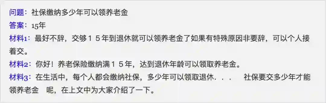 不管是 WebQA 还是 SOGOU,所提供的语料都是“一个问题 + 多段材料 + 一个答案”的形式,并没有特别指明答案出现在哪段材料的哪个位置。