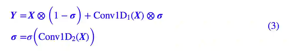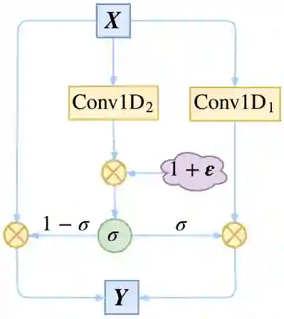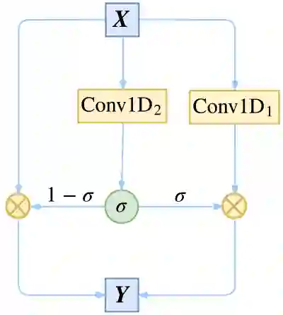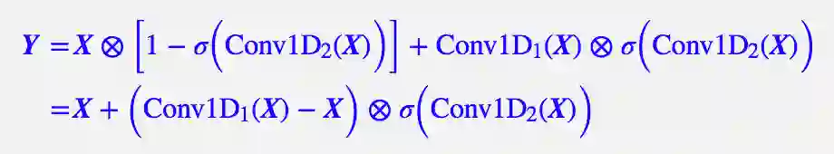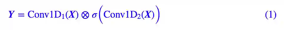注意这里的两个 Conv1D 形式一样(比如卷积核数、窗口大小都一样),但权值是不共享的,也就是说参数翻倍了,其中一个用 sigmoid 函数激活,另外一个不加激活函数,然后将它们逐位相乘。