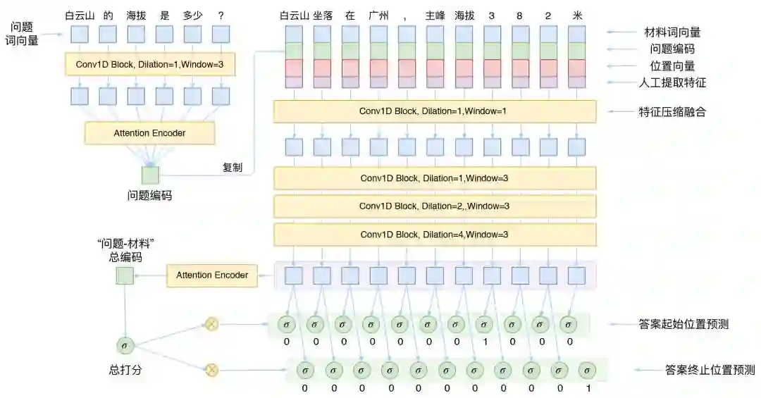 这时候我们得到了一个混合了问题、材料信息的特征序列,直接对这个序列进行处理即可,所以后面接了几层卷积进行编码处理,然后直接对序列进行标注,而不需要再对问题进行交互了。