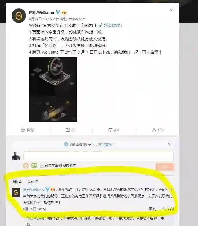 在腾讯WeGame官方微博的评论下方,官方回应道:“我们知道,绝地求生大逃杀、H1Z1 这类的游戏广受玩家的好评,我们不会辜负大家对我们的期待,正在加倍努力工作及积极引进相关品类游戏去回报玩家,关于新消息我们会适时公布,敬请期待!”