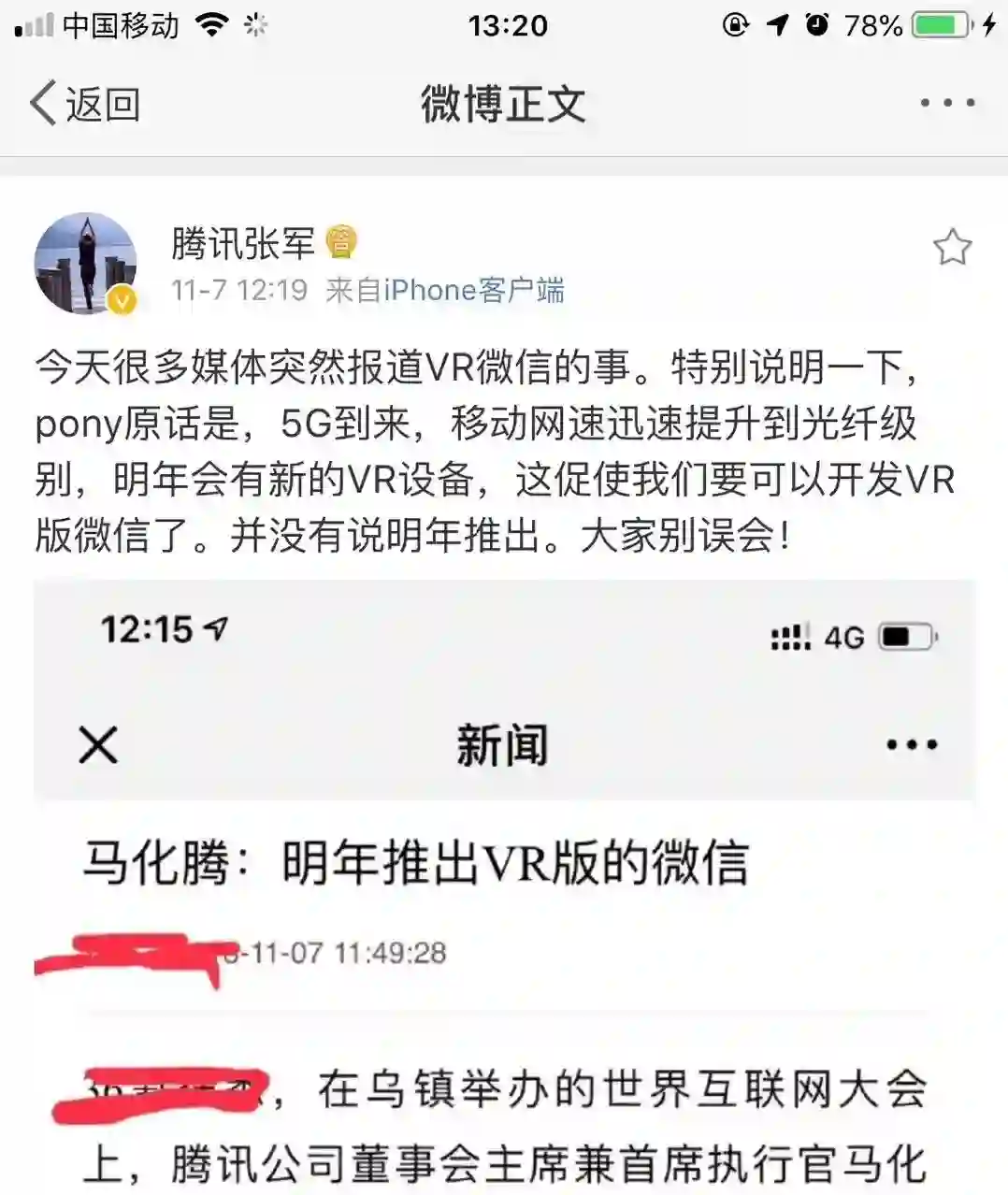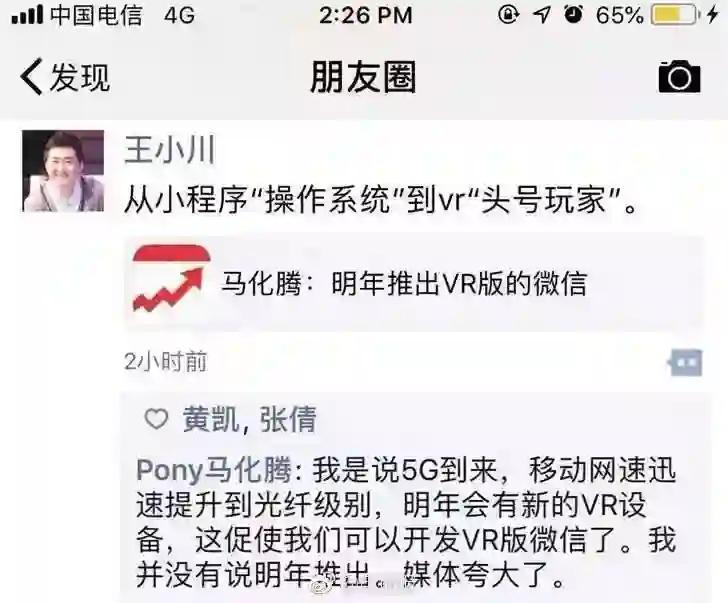 腾讯公司董事会主席兼首席执行官马化腾在演讲中称,由于5G到来,移动网速提升至光纤级别,他决定认真考虑对VR版本微信的开发。
