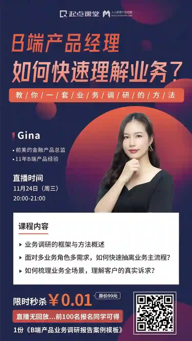 特邀拥有11年互联网金融、企业数字化转型咨询经验,前美的金融产品总监@Gina老师用1小时为你解答B端产品经理如何做好一份业务调研,更有在线1V1互动答疑的机会等你来!