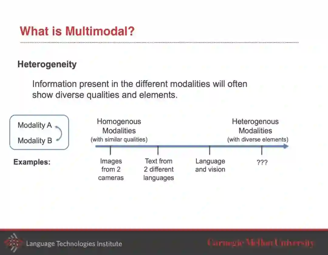 多模态机器学习(MMML)是一个充满活力的多学科研究领域,研究从多个模态建模异构数据的计算方法。本课程介绍机器学习和深度学习的基本概念,涉及多模态机器学习的五个主要挑战: