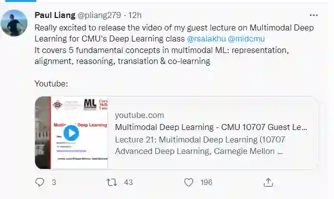 后台回复“ML170” 就可以获取《什么是多模态ML?CMU-Paul Liang170页PPT讲述《多模态机器学习》,阐述多模态深度学习5大进展,附ppt与视频》专知下载链接