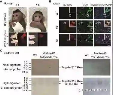 值得注意的是,研究人员在卵巢的大部分区域都检测到mCherry的表达,说明基因敲入猴子具有生殖系传递的可能性。所有组织的PCR鉴定测序结果都表明在5’和3’连接处的整合是正确的。此外,Southern印迹分析进一步证实# 2和# 3猴的基因整合是正确的且没有额外的基因随机整合。