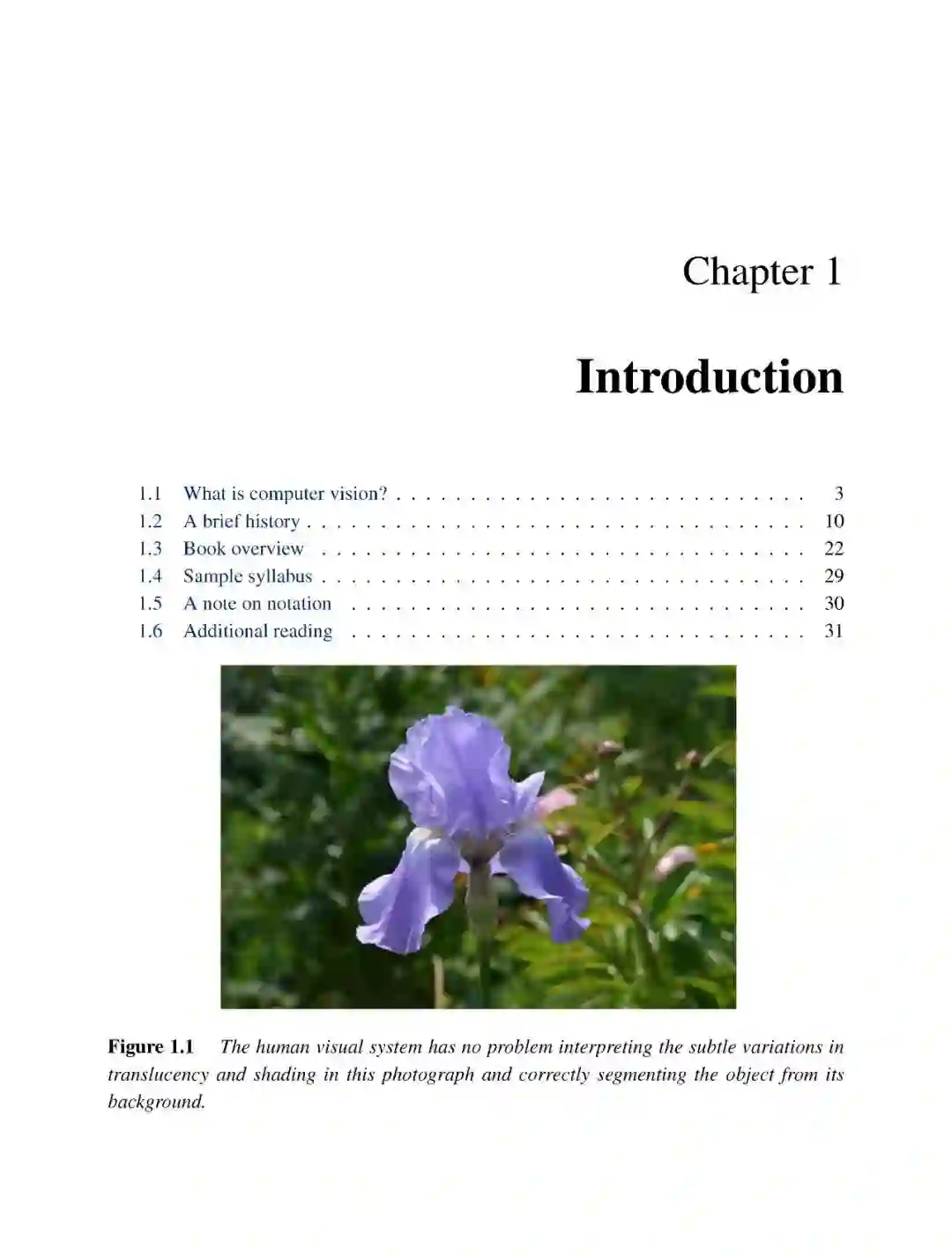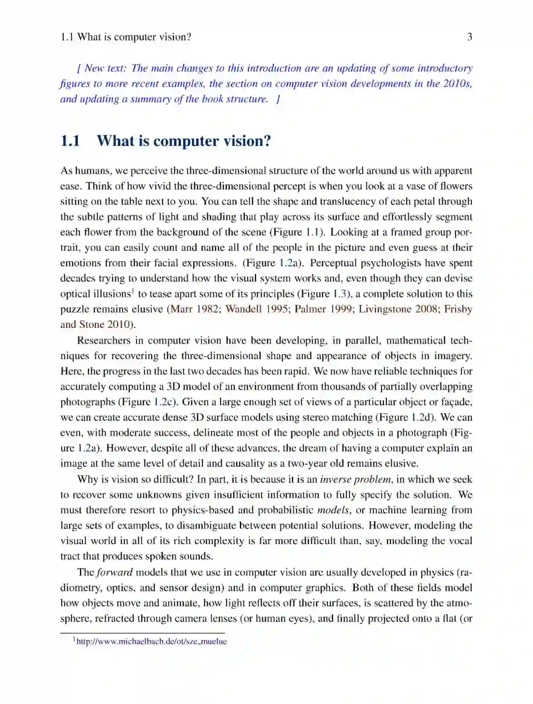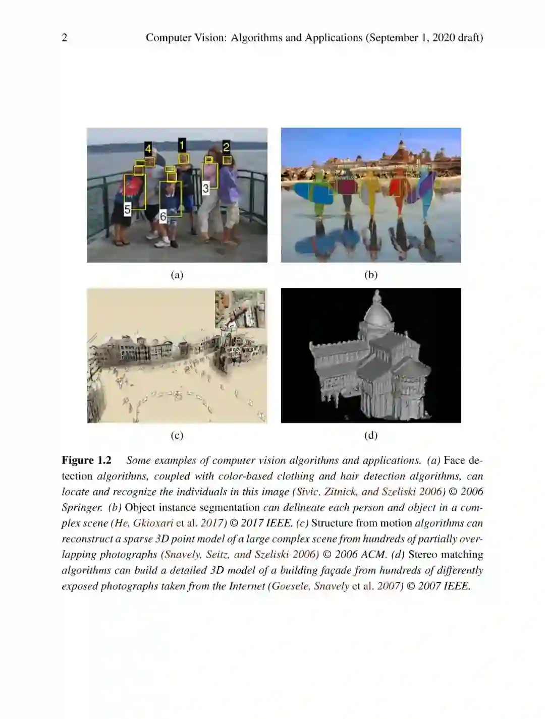 从那时起,华盛顿大学和斯坦福大学就一直使用类似的课程大纲和项目导向的课程结构来进行常规计算机视觉课程的教学(在斯坦福大学,在2003年这门课程由我和David Fleet共同讲授)。类似的课程大纲也被其他很多大学所采用,并被纳入计算摄影学相关的更专业的课程。(有关如何在课程中使用本书的建议,请参见1.4节的表1.1。)