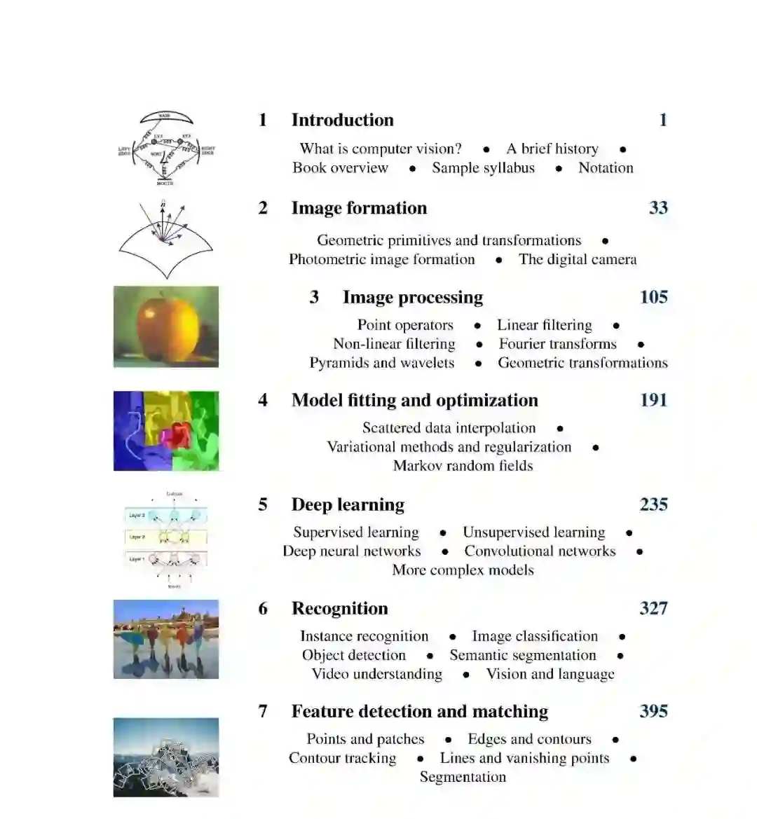 由于端到端深度学习系统不再需要开发构建模块,如特征检测、匹配和分割,因此识别章节已经在书的早些时候移到了第6章。许多选修视觉课程的学生主要对视觉识别感兴趣,因此在课程的早期呈现这些资料,可以使学生更容易以这些主题为期末专题的基础。