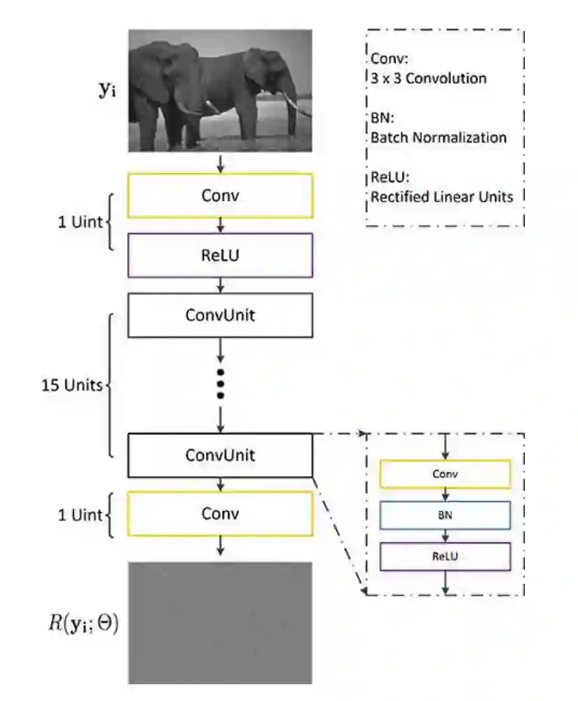 作者使用的网络结构类似于 DnCNN,CNN 被视为预测残留图像的残差单元,即输入噪声图像和潜在干净图像之间的差异。