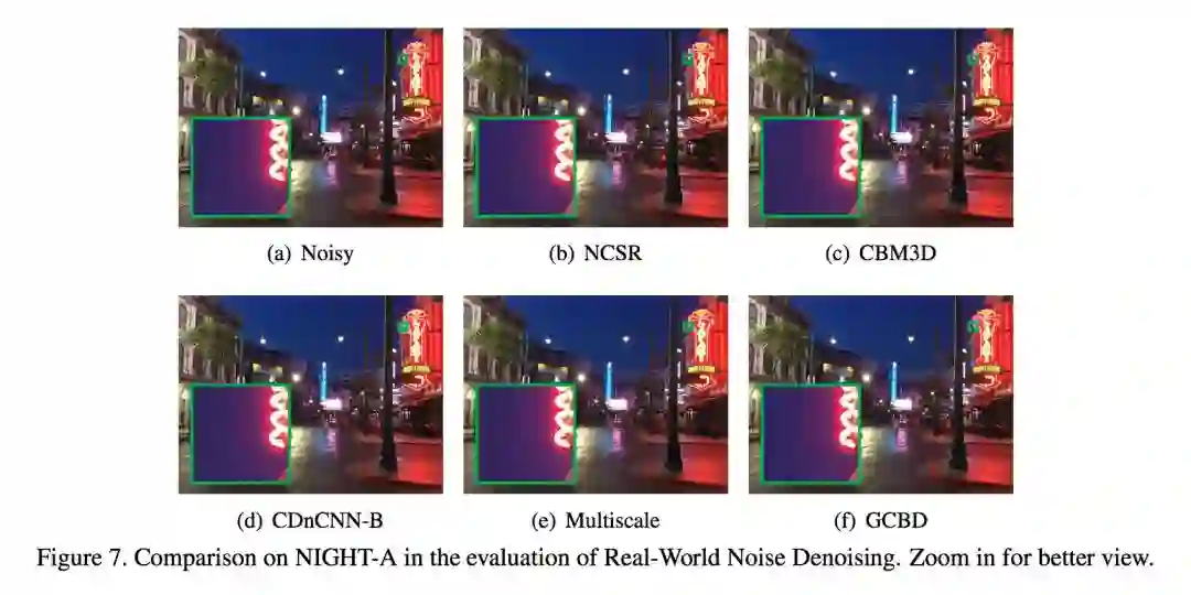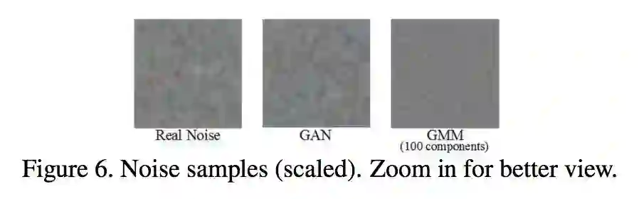 可以看到利用 GAN 估计的噪声比 GMM 估计的噪声更接近与真实图像噪声。作者认为原因是 GMM 中高斯模型的数量以及显式地对噪声进行建模会限制 GMM 的估计能力,而 GAN 则是隐式地对噪声进行估计,所以效果会更好一些。