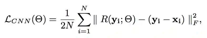 为了训练 CNN,首先需要构建一个配对的训练数据集,从刚才得到的经过 GAN 扩展的 V' 数据集,然后再从干净图像的数据集中通过图像分块(patch 大小 d×d)的方法得到干净图像数据集 X。在 V' 中的 noise block 随机地加入到 X 中,得到集合 Y。其中有。然后通过集合 X 和 Y 构成配对数据集 {X,Y}。