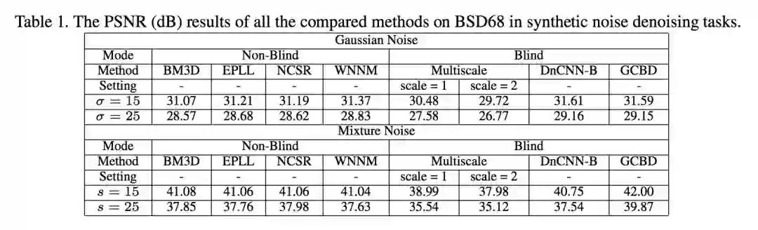 可以看到在高斯盲去噪方面,文章提出的方法 GCBD 和 DnCNN 不相上下,而在合成噪声去噪方面,GCBD 则达到了最高水平。文中所用到的混合噪声为 10% 的均匀分布噪声(分布区间为[-s,s]),20% 的高斯噪声(N(0,1)),70%的高斯噪声(N(0,0.01)。