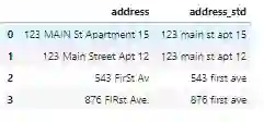 df_add_ex['address_std'] = df_add_ex['address'].str.lower()df_add_ex['address_std'] = df_add_ex['address_std'].str.strip() # remove leading and trailing whitespace.df_add_ex['address_std'] = df_add_ex['address_std'].str.replace('\\.', '') # remove period.df_add_ex['address_std'] = df_add_ex['address_std'].str.replace('\\bstreet\\b', 'st') # replace street with st.df_add_ex['address_std'] = df_add_ex['address_std'].str.replace('\\bapartment\\b', 'apt') # replace apartment with apt.df_add_ex['address_std'] = df_add_ex['address_std'].str.replace('\\bav\\b', 'ave') # replace apartment with apt.df_add_ex