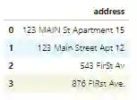 # no address column in the housing dataset. So create one to show the code.df_add_ex = pd.DataFrame(['123 MAIN St Apartment 15', '123 Main Street Apt 12 ', '543 FirSt Av', ' 876 FIRst Ave.'], columns=['address'])df_add_ex
