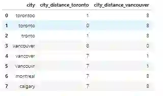 from nltk.metrics import edit_distancedf_city_ex = pd.DataFrame(data={'city': ['torontoo', 'toronto', 'tronto', 'vancouver', 'vancover', 'vancouvr', 'montreal', 'calgary']})df_city_ex['city_distance_toronto'] = df_city_ex['city'].map(lambda x: edit_distance(x, 'toronto'))df_city_ex['city_distance_vancouver'] = df_city_ex['city'].map(lambda x: edit_distance(x, 'vancouver'))df_city_ex