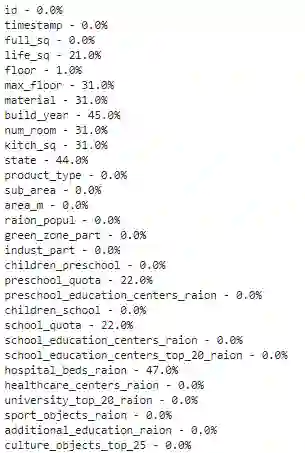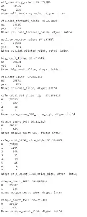 # import packagesimport pandas as pdimport numpy as npimport seaborn as snsimport matplotlib.pyplot as pltimport matplotlib.mlab as mlabimport matplotlibplt.style.use('ggplot')from matplotlib.pyplot import figure%matplotlib inlinematplotlib.rcParams['figure.figsize'] = (12,8)pd.options.mode.chained_assignment = None# read the datadf = pd.read_csv('sberbank.csv')# shape and data types of the dataprint(df.shape)print(df.dtypes)# select numeric columnsdf_numeric = df.select_dtypes(include=[np.number])numeric_cols = df_numeric.columns.valuesprint(numeric_cols)# select non numeric columnsdf_non_numeric = df.select_dtypes(exclude=[np.number])non_numeric_cols = df_non_numeric.columns.valuesprint(non_numeric_cols)