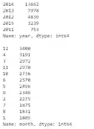 df['timestamp_dt'] = pd.to_datetime(df['timestamp'], format='%Y-%m-%d')df['year'] = df['timestamp_dt'].dt.yeardf['month'] = df['timestamp_dt'].dt.monthdf['weekday'] = df['timestamp_dt'].dt.weekdayprint(df['year'].value_counts(dropna=False))print()print(df['month'].value_counts(dropna=False))