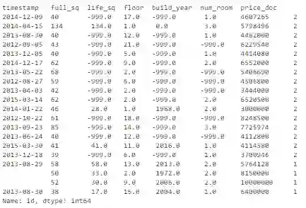 key = ['timestamp', 'full_sq', 'life_sq', 'floor', 'build_year', 'num_room', 'price_doc']df.fillna(-999).groupby(key)['id'].count().sort_values(ascending=False).head(20)