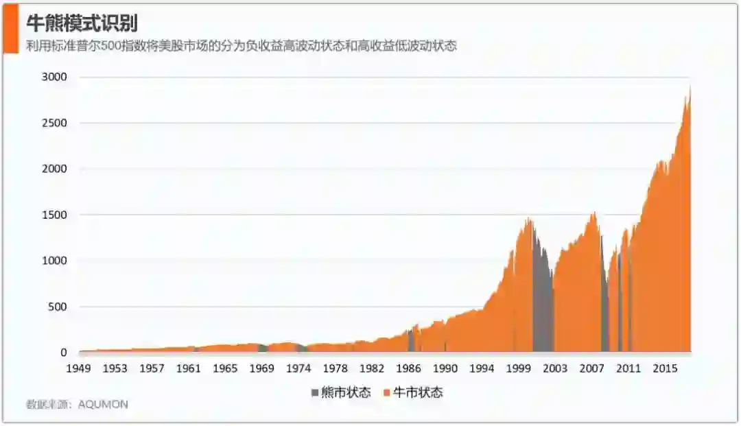 回到金融战场,我们对过去70年来美国标普500指数进行了牛熊识别,将标普500指数分离为负收益高波动以及高收益低波动两个实际状态,以此来表示牛市和熊市阶段下的市场特性。
