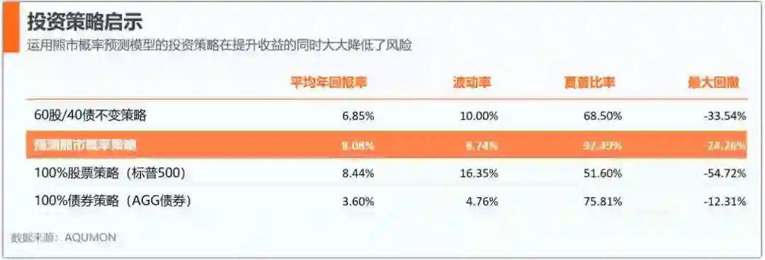 回测结果显示,同样基于60/40经典配置组合,结合了熊市概率的策略年化收益率有近1.2%的超额表现,不仅如此,该策略在风险以及回撤控制上都会比单纯的60/40策略要来的好。