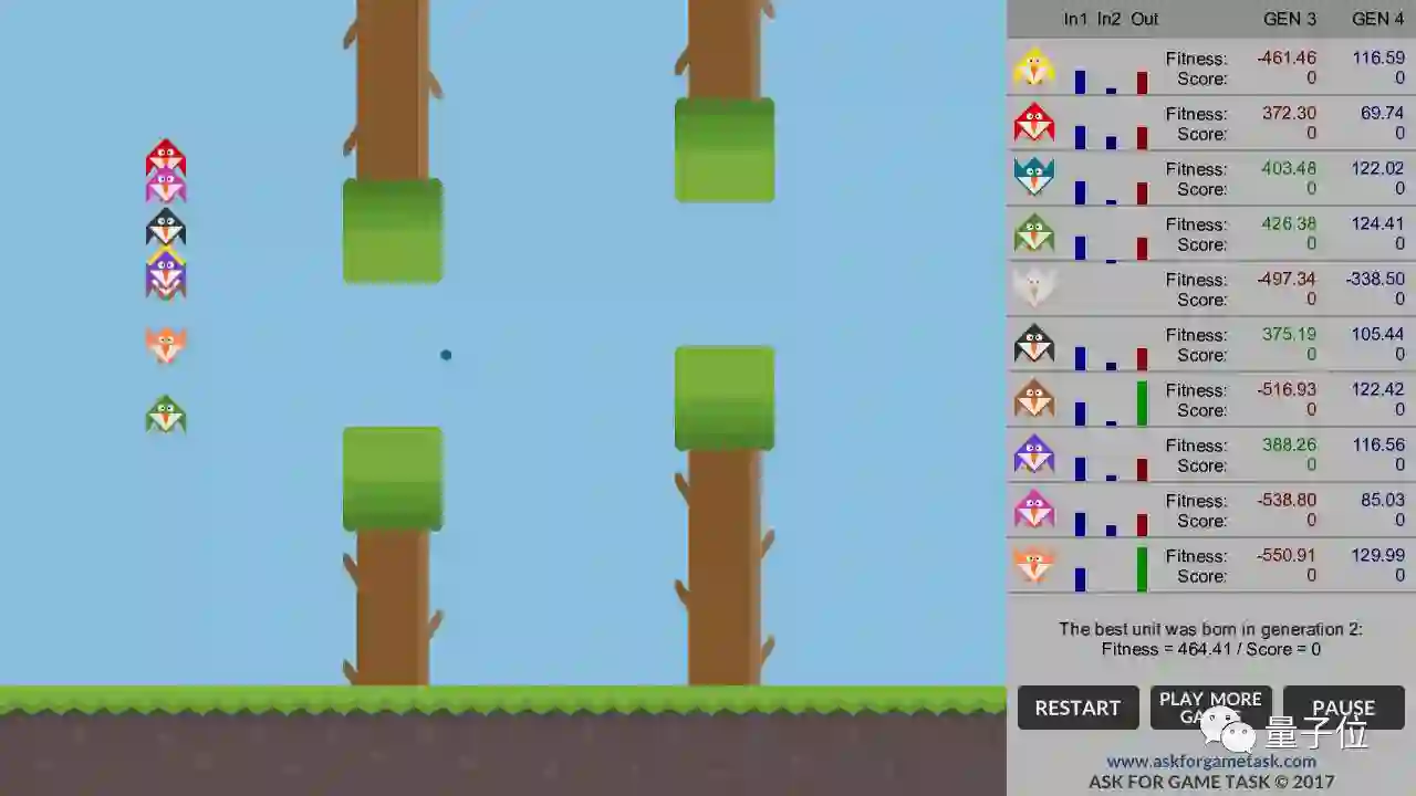 对于上面第4步中遗传算法,下面是实现的步骤。基本上,最好的小鸟个体会生存下来,它们的后代会取代表现最差的那些。