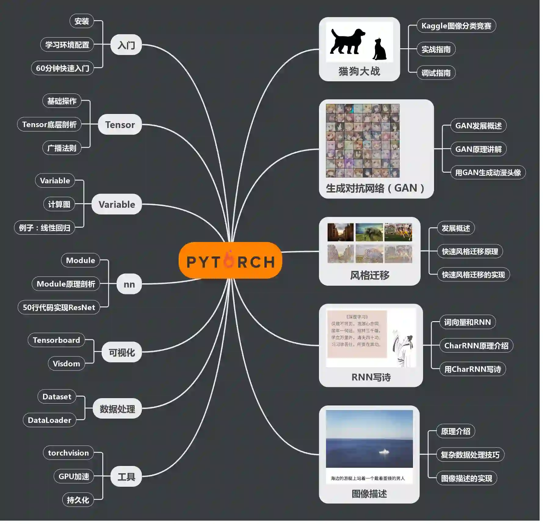实战部分(第六到十章)利用PyTorch实现了几个酷炫有趣的应用,对于这部分的内容,本仓库给出完整的实现代码,并提供预训练好的模型作为demo,供读者测试。