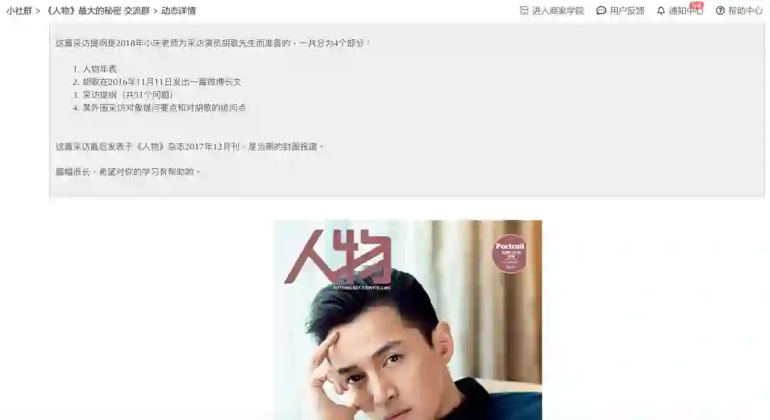 采访提纲,记者压箱底的宝贝。但在写作课中,《人物》主笔安小庆直接将一份近9000字,51个问题的对演员胡歌的采访提纲,完整地分享在小鹅通平台1800多人的小社群中,供购买了写作课“《人物》的最大秘密”的学员,随时浏览、参考。