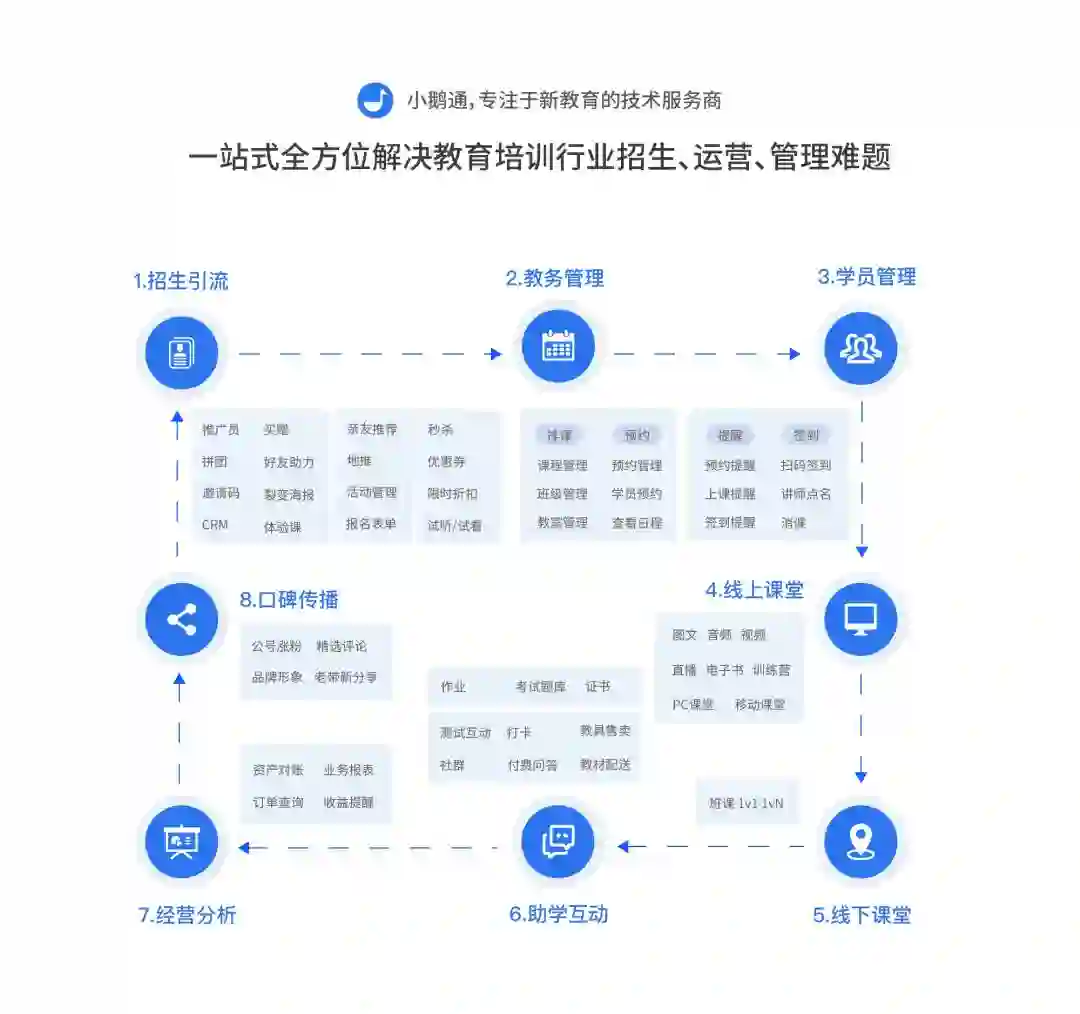 这张图包含了小鹅通目前已有的全部功能,并且代表了现在教育行业对于新教育转型的整个产业闭环,解决了教育机构从学员招募和课程销售中的各个环节的问题。6月27日,小鹅通在北京携手众多教育行业大咖解读新教育行业发展趋势,升级为专注新教育的技术服务商!