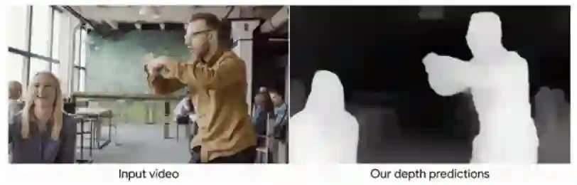我们的模型可以预测深度图(右图,离摄像头越近,图中越亮),场景中的人和摄像头都在自由移动。