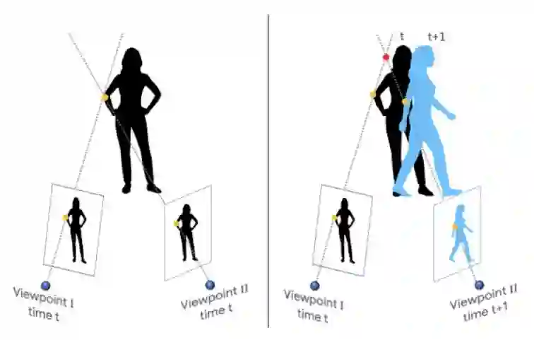 左图:传统的立体设置假设至少有两个观察点在同时捕捉场景。右图:我们考虑摄像头和拍摄对象都在移动的情况。