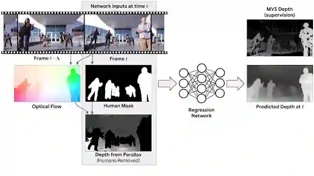 人们在摄像头在场景中移动时模仿人体模特,我们将其作为训练数据。我们使用传统的MVS算法来估计深度,并在深度预测模型的训练中将其用于监督。