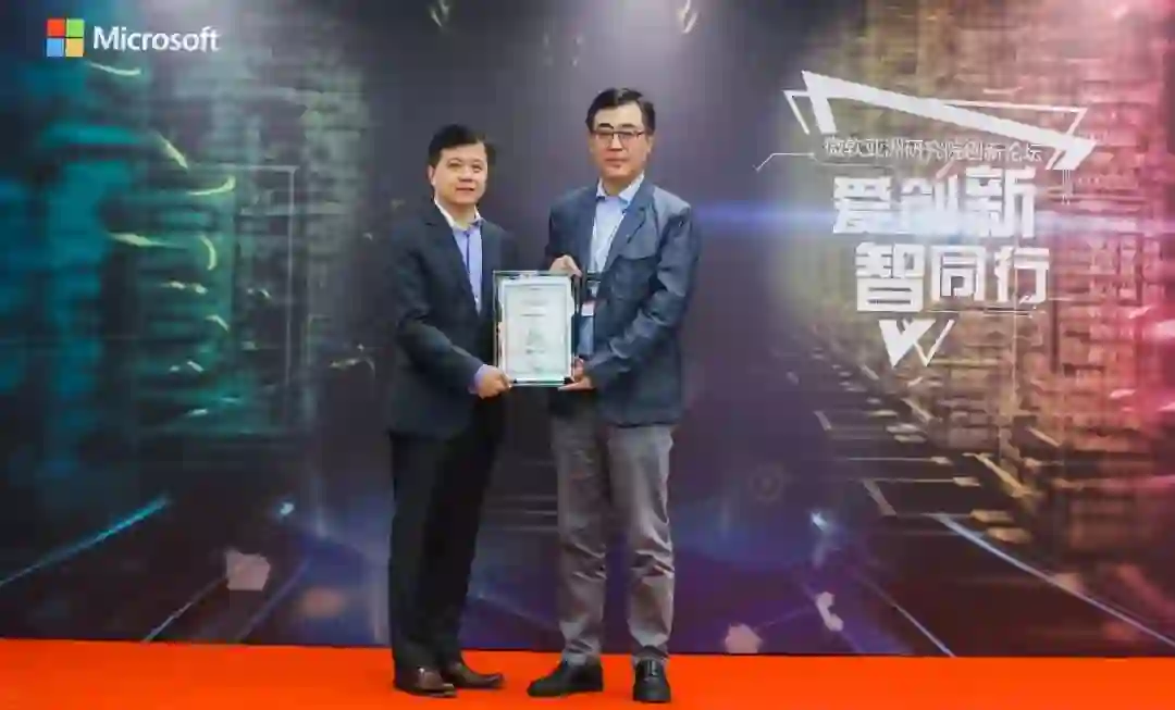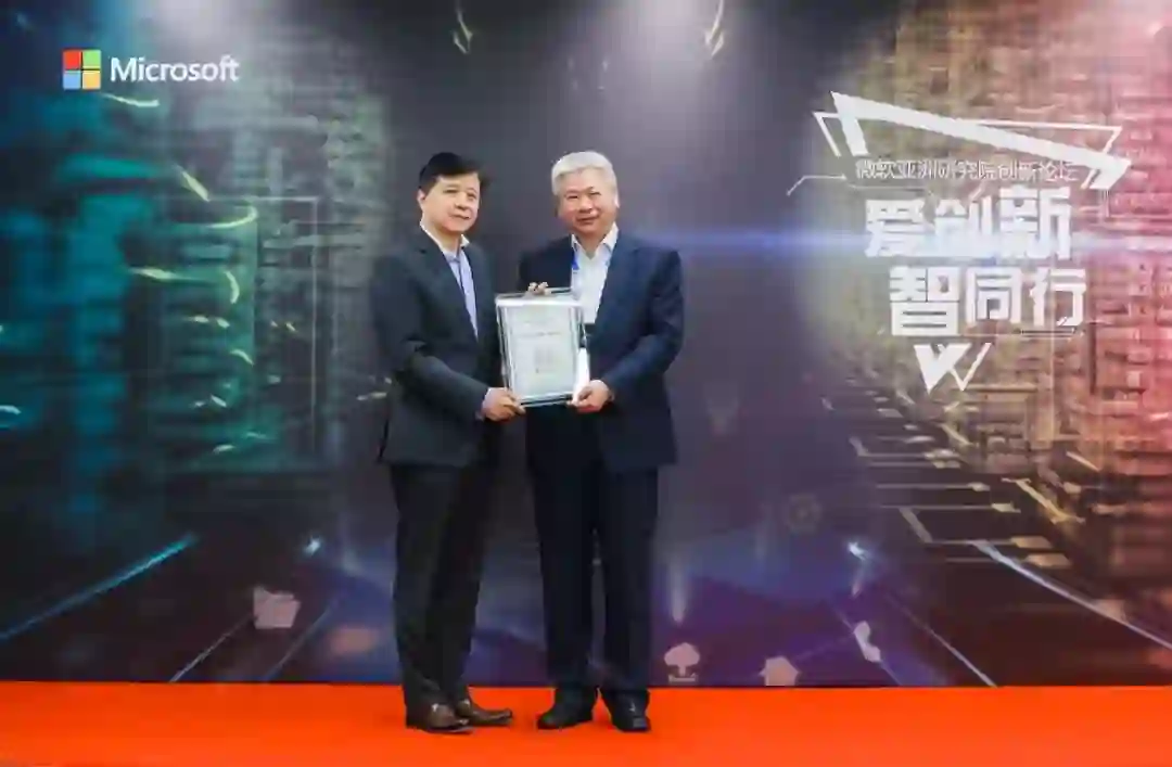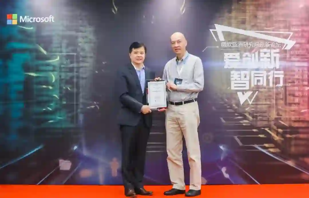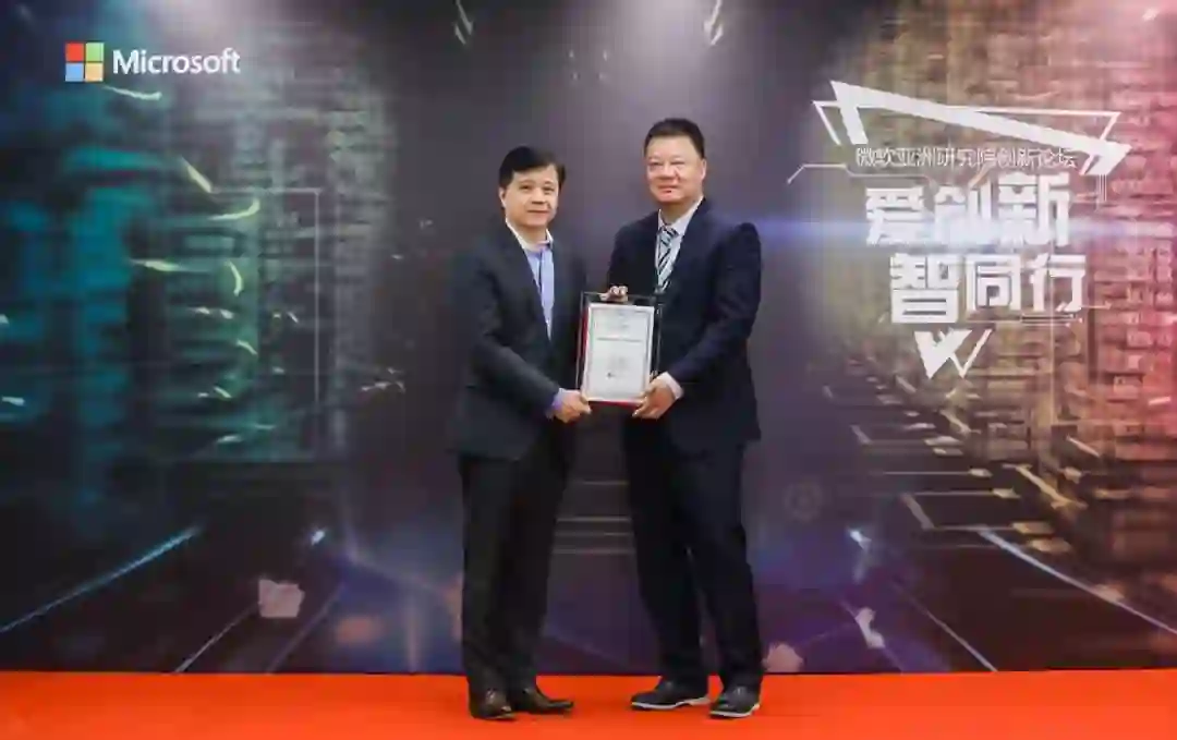 微软亚洲研究院院长洪小文(左)为顺丰科技有限公司CEO幺宝刚(右)颁发会员证书