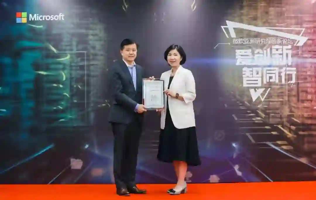 微软亚洲研究院院长洪小文(左)为上海仪电集团董事长蔡小庆(右)颁发会员证书
